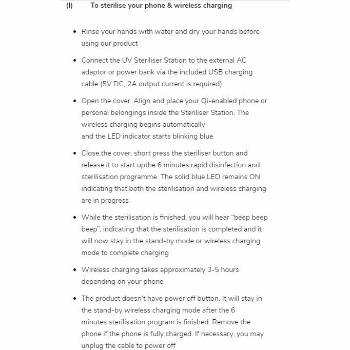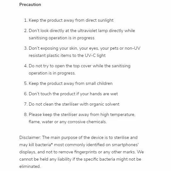 The product has a wireless charging function, which recharges your smartphones wirelessly via the Qi wireless charging standard while it is being sterilised. Other than smartphone, you may also sanitise different personal belongings that will fit inside such as smart watches, keys and any other small objects. Compatible with most smartphones up to 7 inches in size such as iPhone, Samsung, LG, Huawei, etc. Ideal for use at home, office or hotel.